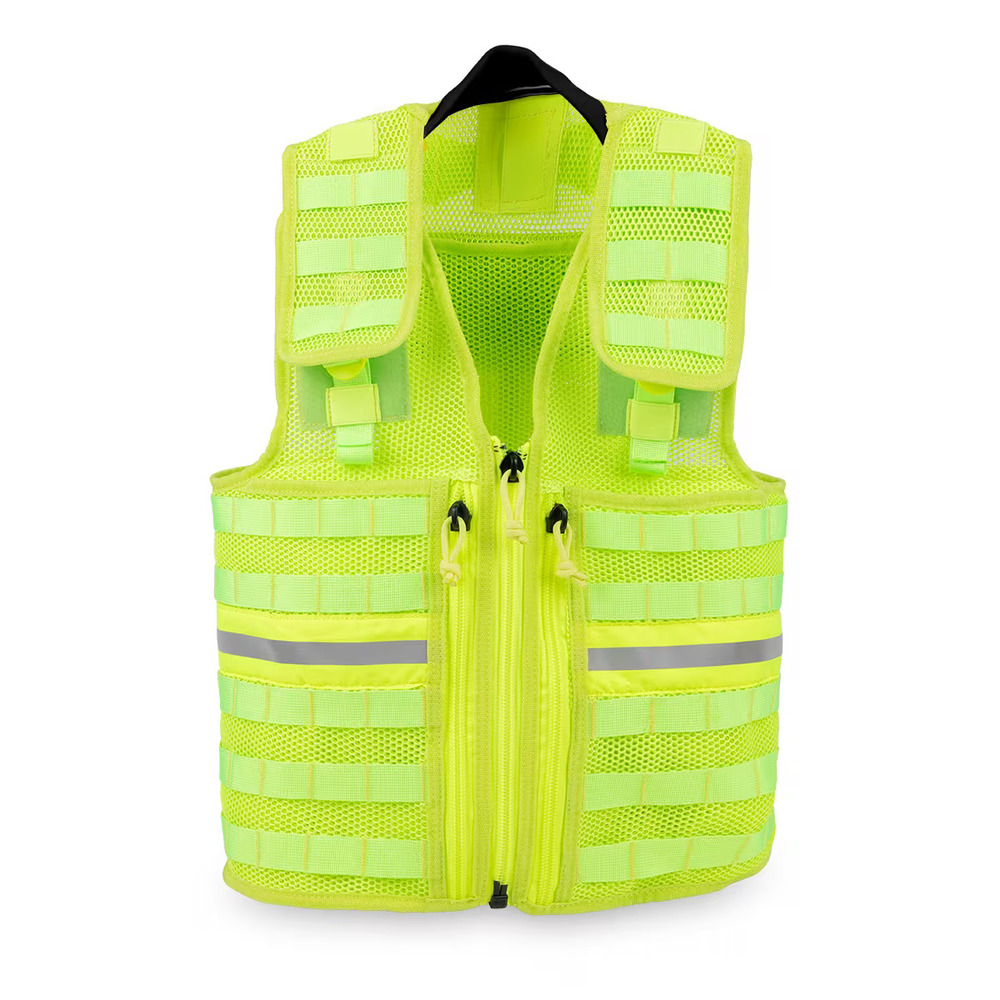 Έχει κατασκευαστεί από διχτυωτό ύφασμα με ανακλαστικές λωρίδες υψηλής ορατότητας κατά μήκος της μέσης. Διαθέτει δυο εξωτερικές κόκκινες θήκες στην μπροστινή περιοχή, οι οποίες στα εσωτερικά τοιχώματά τους έχουν διαχωριστικές τσέπες και ιμάντες στερέωσης αντικειμένων, ενώ εξωτερικά τους η μια διαθέτει θήκη ψαλιδιού ενώ η δεύτερη διαθέσει διάφανη θήκη ταυτότητας. Οι θήκες αυτές είναι ιδανικές για να έχει ο διασώστης άμεσα προσβάσιμα τα υλικά που θα χρειαστεί πρώτα σε μια κατάσταση που χρήζει άμεσης επέμβασης. Επιπλέον, διαθέτει τέσσερις επίπεδες τσέπες στο μπροστινό μέρος του γιλέκου διασώστη μεγάλης χωρητικότητας.