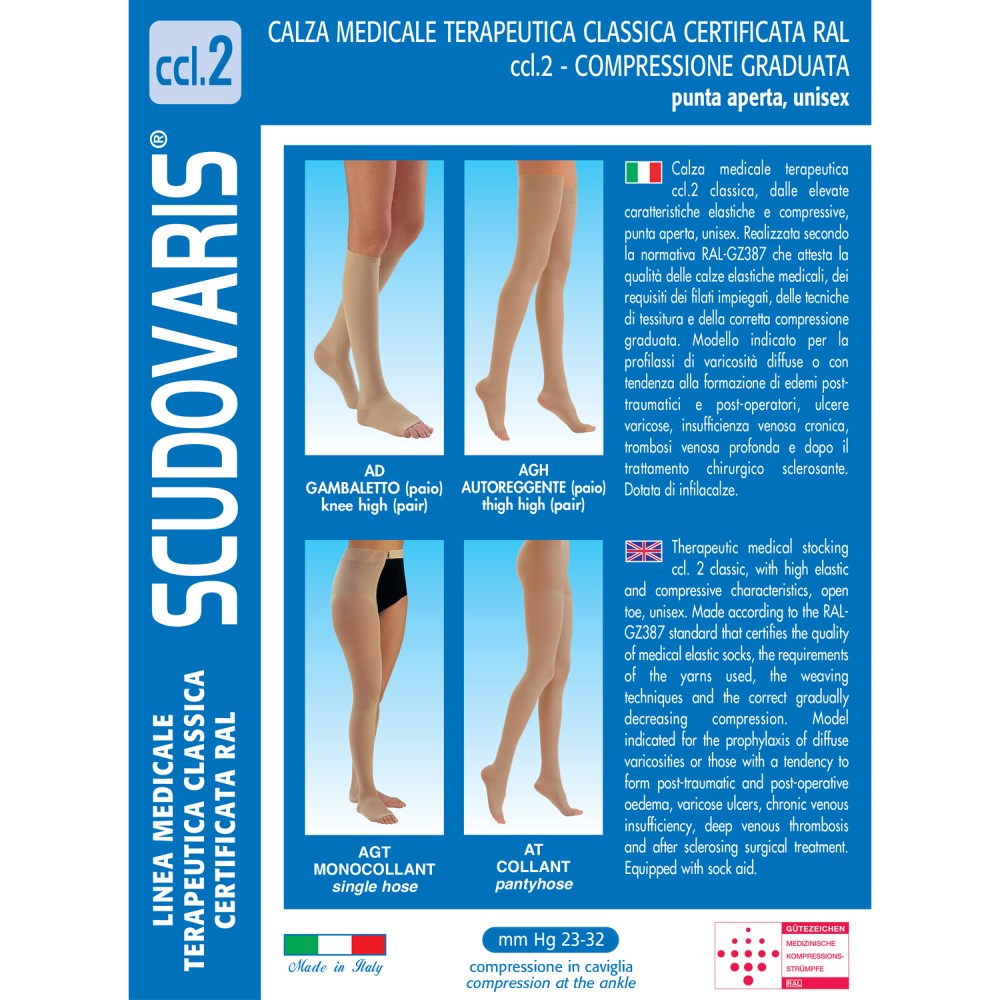 Οι κάλτσες κάτω γόνατος ccl.2 της ιατρικής σειράς Scudovaris μπορούν να φορεθούν τόσο από γυναίκες όσο και άνδρες, διαθέτουν ενισχυμένη φτέρνα που αυξάνει την αντοχή και διασφαλίζει την τοποθέτηση της κάλτσας στο πόδι και ανοιχτά δάχτυλα για την ανακούφιση όσων υποφέρουν από προβλήματα στα δάχτυλα ή στα νύχια των ποδιών καθώς και για τον έλεγχο της κατάστασης των δακτύλων σε κλινήρεις ασθενείς. Το ειδικό τελείωμα τους κάτω από το γόνατο που στηρίζει τις κάλτσες χωρίς να σφίγγει, τις καθιστούν ιδανικές για χρήση καθ’όλη την διάρκεια της ημέρας χωρίς πρόβλημα.